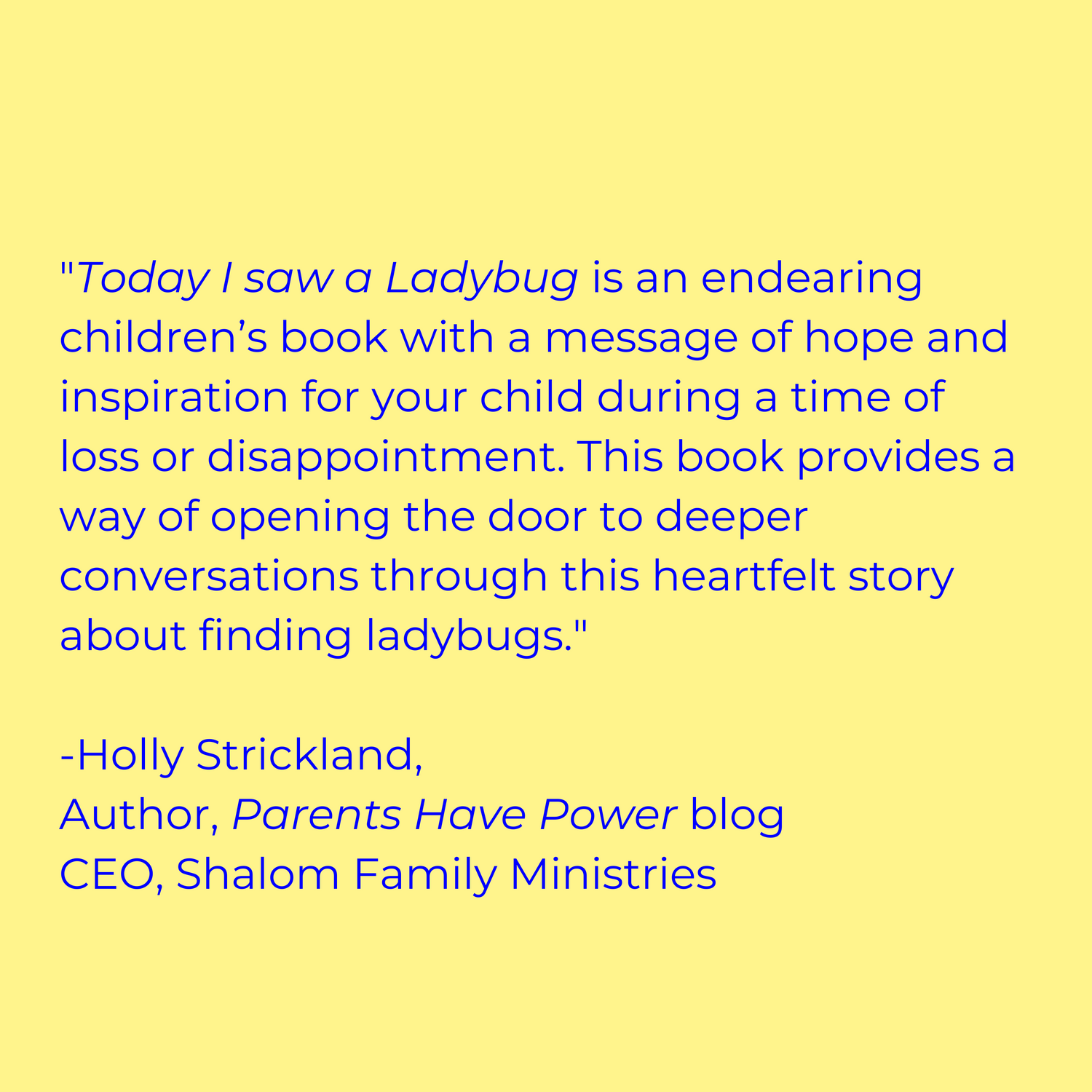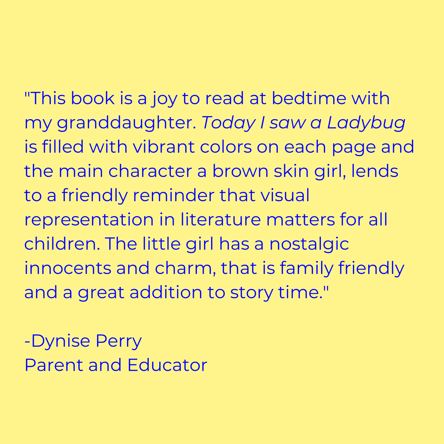 Thank you for visiting this website where I share the things I create to remind you of your self-worth and empower you to always SHINE! I value my role as a black woman, wife, mother, daughter, sister, and friend, and I'm committed to helping others find the good in life's darkest moments. My first book, Today I Saw A Ladybug, is the result of my own grieving process and desire to help others - young and old - deal with the loss of a loved one. I hope you'll consider sharing it with others who are dealing with a similar experience.